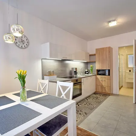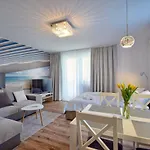 The 40 m^2 Blizej Morza 16 Premium Apartment includes a sun terrace and is located nearly 25 minutes' walk from Stadium Kolobrzeg. Guests can use Wi-Fi and a private parking garage, which is available on site.